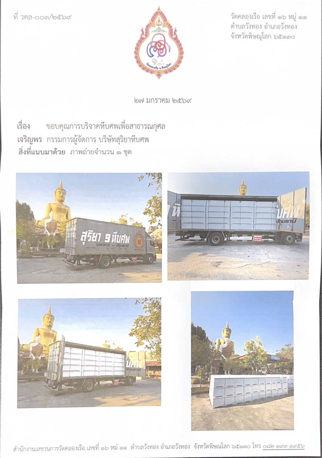 27/1/69 ทางสุริยาหีบศพเป็นตัวแทส่งมอบหีบบริจาคให้กับวัดคลองเรือจำนวน 80 ใบ