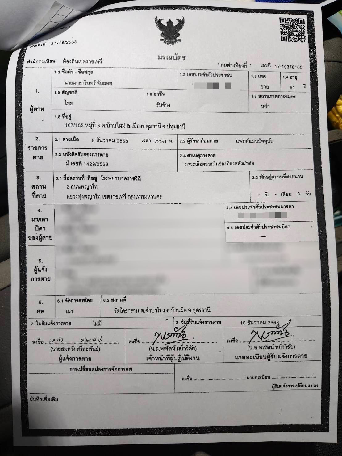 10/12/68 ทางสุริยาหีบศพได้ส่งมอบหีบบริจาคให้กับญาติเพื่อส่งกลับภูมิลำเนาจำนวน 1 ใบ